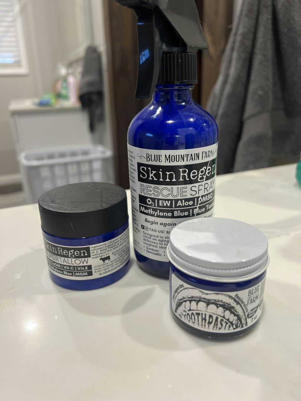 Ingredients : Electrolyzed RO Water, Sodium Chloride, ozonated organic Extra Virgin Olive Oil, DMSO, Rosemary Extract, Aloe Vera Gel, Methylene Blue, Blue Tansy e.o., plant-based emulsifier, Vit. E oil